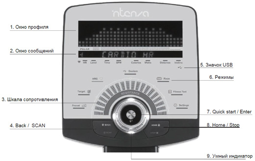Модель тренажера 550Ti компании Intenza разработана и оборудована таким образом, чтобы Вы могли за короткий промежуток времени достичь всевозможные цели в плане тренировок. Пробуйте экспериментировать с каждой опцией тренажера, чтобы найти для себя самый оптимальный режим тренировки. Основные управляющие функции консоли, а также особенности дисплея приведены ниже.