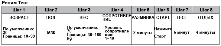 В режиме физического теста в течение 5 минут Вы можете настраивать не только угол наклона, но и сопротивление согласно Вашим физическим возможностям. Придерживайтесь значения 70 SPM и удерживайте пульс на необходимом значении. После окончания теста таймер автоматически отсчитает 10 секунд, и тренажер перейдет в режим отдыха. В этом режиме Вам так же придется придерживаться заданных значений. Рекомендуется применять телеметрический пояс для получения более точных результатов. Кроме того, Вы можете держаться за контактные площадки, которые располагаются на рукоятках, чтобы система смогла снять телеметрические данные. После окончания теста и 4-х минут отдыха, результаты тестирования появятся в окне профиля. Чтобы расшифровать результат, Вам следует обратиться к ТАБЛИЦЕ VO2.