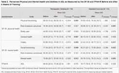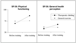 Сравнение групп показало, что в группе по терапевтическому восхождению отмечены значительные улучшения по двум из восьми шкал SF-36 в физическом компоненте здоровья: физическое функционирование (P = 0,010) и общее состояние здоровья (P = 0,018). На Рис. 2 проводится сравнение (ДО и ПОСЛЕ) для обеих групп, а в Таблице 3 приведены статистические данные по группам. По всем другим шкала SF-36 и FFbH-R разницы между курсами лечения отмечено не было (все P > 0,05).