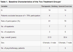 Психологические же факторы, такие как чувство боли и ощущение недееспособности, и психосоциальные факторы, такие как страхование от несчастного случая на производстве и дискриминация среди работающих и неработающих пациентов, наоборот играют здесь огромную роль. Несмотря на это, в дальнейших исследования терапевтического скалолазания необходимо учесть измерения мышечных и психологических улучшений, чтобы до конца понять, какие изменения в физиологических способностях приводят к изменениям в состоянии здоровья. Это может быть не укрепление мышц как таковое, а взаимодействие координации и концентрации, которое положительно влияет на физические способности. Настоящее исследование представляет собой первую попытку оценить эффективность терапевтического скалолазания. Результаты говорят о том, что восхождение сравнимо с упражнениями ЛФК, а в некоторых случаях даже превосходит их. Исследование проводилось на примере пациентов реабилитационного центра. Никто из них ранее не занимался альпинизмом. Пациенты выбирались в случайном порядке. С одной стороны, это помогло исключить больных с более высокой мотивацией и желающих заниматься скалолазанием. С другой стороны, участникам не разрешалось самим выбирать программу, что в свою очередь заставило некоторых прекратить занятия (четверо из пяти выбывших участников, т.е. менее 30%, занимались в группе по терапевтическому скалолазанию). Высокая степень выбывания участников из группы, занимающейся скалолазанием, можно также объяснить тем, что амбулаторным больным сложно согласовать график занятий со своими делами. По этой же причине занятия проводились лишь четыре раза в неделю. Пациенты же, занимающиеся ЛФК, могли сами выбирать время занятий. В дальнейших исследованиях необходимо разрешить амбулаторным больным выбирать себе расписание занятий, предложив им альтернативное время. В виду ограничений, связанных с условиями для занятий и альпинистской стенкой, в каждой группе могли заниматься не более 14 человек. В дальнейших исследованиях необходимо увеличить число участников, возможно, за счет организации нескольких групп. Кроме того, это позволит провести дифференциальную оценку амбулаторных и стационарных больных, а также пациентов женского и мужского пола. По результатам данного исследования невозможно предсказать эффект занятий и реабилитации на физическое и психическое состояние здоровья. Конечные измерения необходимо включить в план последующих исследований, чтобы изучить долговременный эффект терапевтического восхождения (например, через полгода после реабилитации). Настоящее исследование показывает, что терапевтического скалолазание не противопоказано пациентам с хроническими болями в пояснице. Терапевтическое восхождение положительно повлияло на общее состояние здоровья и физическое функционирование пациентов, возможно, за счет отвлечения внимания и нового опыта познания связи между движениями и болью. Исследование дает физиотерапевтам научное обоснование к рекомендации таких физических занятий пациентам. В дальнейших исследованиях необходимо изучить физиологический и психологический механизмы терапевтического скалолазания, и как пациенты могут поддерживать положительный опыт физического функционирования после завершения курса реаб