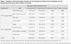 Рисунок 2 По сравнению с группой ЛФК, в группе терапевтического скалолазания была отмечена положительная динамика по двум из восьми шкал SF-36, относящимся к психическому компоненту здоровья: психическое функционирование и общее состояние здоровья. Остальные шкалы показали улучшения для обеих групп без какой-либо существенной разницы. Обсуждение В настоящем исследовании сравнивалась эффективность терапевтического скалолазания и стандартных упражнений ЛФК. В ходе исследования были выявлены улучшения психического и физического здоровья (SF-36) и способностей в повседневной активности (FFbH-R). Исходные данные пациентов по SF-36 и FFbH-R были сравнимы с данными других исследований в области болей в поясничном отделе. После лечения ни группа терапевтического скалолазания, ни группа ЛФК не улучшили свои способности в повседневной активности (FFbH-R). Однако в обеих группах произошли существенные улучшения по трем из восьми шкал SF-36 (жизненная активность, психическое здоровье и социальное функционирование). По одной шкале (ролевое функционирование, обусловленное физическим состоянием) улучшение отмечено только в группе, занимающейся ЛФК. По двум шкалам (физическое функционирование и общее состояние) улучшение отмечено только в группе, занимающейся скалолазанием. Это говорит о том, что терапевтическое восхождение и ЛФК сравнимы по эффективности. Сравнивая обе программы, эффективность восхождения намного выше, чем у ЛФК по двум шкалам SF-36: физическое функционирование и общее состояние здоровья.