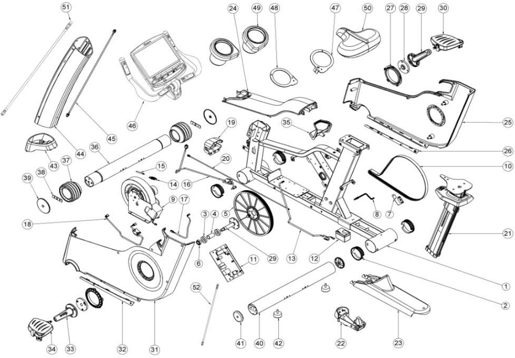 | № | Деталь | № | Деталь | | 1 | Покрыт., основн., рама | 27 | Покрытие, шатун | | 2 | Втулка, ножка | 28 | Шатун, Тормоз | | 3 | Подшипник, шар., 6004ZZ | 29 | Шатун, П | | 4 | Рукав, опор., подшипник | 30 | Собр., Педаль, П | | 5 | Собр., шкив | 31 | Покрытие, Л | | 6 | Гайка, нейлон | 32 | Покрытие, бок, Л | | 7 | Собр., сенсор | 33 | Шатун, Л | | 8 | Кабель, сенсор | 34 | Собр., Педаль, Л | | 9 | Магнитная система | 35 | Покрытие, настройка, седло | | 10 | Ремень привода | 36 | Покрыт., базов., перед. | | 11 | Собр., heatsink | 37 | Перед., колесо | | 12 | Батарея | 38 | Тормоз, колесо, перед. | | 13 | Кабель, батарея | 39 | Покрыт., покрытие, колесо | | 14 | Пружина | 40 | Покрыт., базов., зад. | | 15 | Винт, пружина | 41 | Крышка, базов. | | 16 | Собр., кабель, LCB, рама | 42 | Ножка, настроечная | | 17 | Кабель, гибрид | 43 | Кольцо, вертикаль., стойка | | 18 | Собр., Кабель, гибрид | 44 | Вертикаль., стойка, перед. | | 19 | Покрытие, перед | 45 | Сигнальный кабель | | 20 | Джек, силов., DC, кабель | 46 | Собр., консоль | | 21 | Собр., стойка, седло. | 47 | Тормоз, держатель, П | | 22 | Настроечная ручка | 48 | Тормоз, держатель, Л | | 23 | Покрытие, рама, зад. | 49 | Держатель бутылки | | 24 | Покрытие, рама, верх. | 50 | Седло, 550UBe | | 25 | Покрытие, П, втулка | 51 | Кабель, TV, вертикаль. | | 26 | Покрытие, бок., П | 52 | Кабель, TV, рама | |