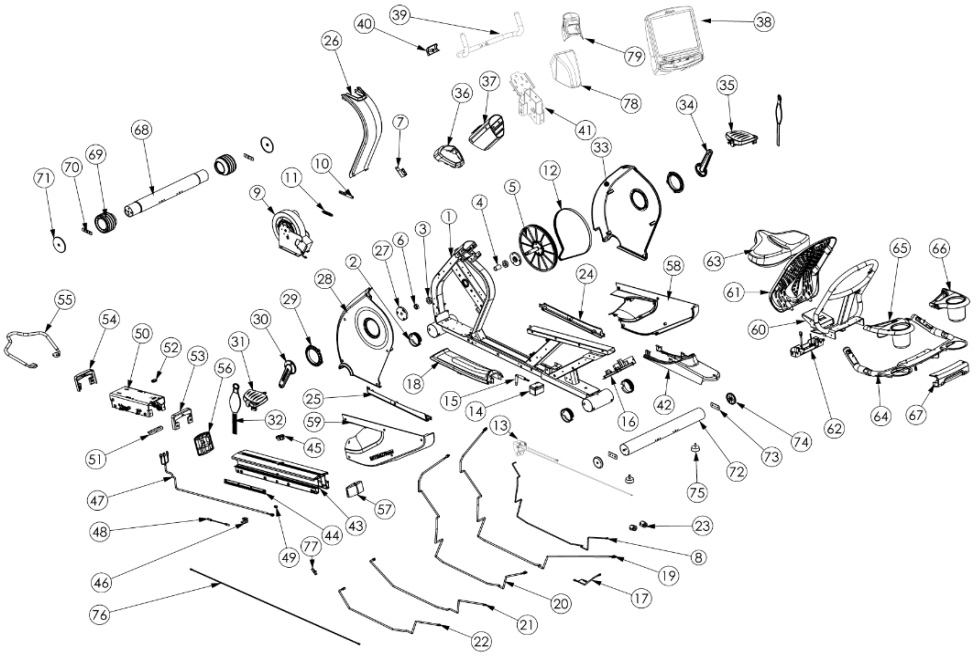 | № | Деталь | № | Деталь | | 1 | Покрыт., рама, основн. | 41 | Покрыт., консоль, Тормоз | | 2 | Втулка, ножка | 42 | Покрытие, зад, верх | | 3 | Подшипник, шар., 6004ZZ | 43 | Трэк | | 4 | Рукав, опор., подшипник | 44 | Тормоз, слайдер, седло | | 5 | Собр., вал, шкив | 45 | Втулка, защелка | | 6 | Гайка, нейлон | 46 | Тормоз, провод, трэк | | 7 | Собр., сенсор | 47 | Кабель, сигнал, трэк | | 8 | Кабель, скорость , рама | 48 | Пульс, hand | | 9 | Магнитная система | 49 | Стикер, трэк | | 10 | Тормоз, натяж. ремня, настр. | 50 | Слайдер, seat | | 11 | Пружина | 51 | Тормоз, опор. | | 12 | Ремень привода | 52 | Втулка, защелка | | 13 | Собр., покрытие, силов. | 53 | Покрытие, трэк, зад. | | 14 | Батарея | 54 | Покрытие, трэк, перед | | 15 | Собр., батарея | 55 | Overmold bar | | 16 | Собр., радиатор | 56 | Покрытие, трэк, перед. | | 17 | Кабель, батарея, рама | 57 | Покрытие, трэк, зад | | 18 | Собр., Покрытие, рама, Mid | 58 | Собр., Покрытие, рама, бок., зад., П | | 19 | Кабель, сенсор, рама | 59 | Собр., Покрытие, рама, бок., зад., Л | | 20 | Кабель, signal, рама | 60 | Покрыт., зад., седло | | 21 | Кабель, гибрид, силов. | 61 | Собр., покрытие, седло | | 22 | Кабель, гибрид, контроль. | 62 | Собр., HR соед., коробка | | 23 | Сердечник, феррит | 63 | Собр., седло | | 24 | Покрытие, рама, бок, сред, П | 64 | Собр., рукоятка, седло | | 25 | Покрытие, рама, бок, сред, Л | 65 | Собр., Держатель, Л | | 26 | Покрытие, рама, верх. | 66 | Собр., держатель, П | | 27 | Шатун, Тормоз | 67 | Покрытие, рукоятка | | 28 | Покрытие, рама, перед., Л | 68 | Покрыт., база, перед | | 29 | Покрытие, шатун | 69 | Колесо, перед | | 30 | Шатун, Л | 70 | Тормоз, колесо, перед. | | 31 | Педаль, стандарт., Л | 71 | Покрыт., покрытие, колесо | | 32 | Педаль, ремень | 72 | Покрыт., базов., зад | | 33 | Покрытие, рама, перед, П | 73 | Тормоз, базов., зад. | | 34 | Шатун, П | 74 | Крышка, базов. | | 35 | Педаль, стандарт., П | 75 | Ножка, настроечная | | 36 | Покрытие, верх., кольцо | 76 | Кабель, тенсор тепла | | 37 | Вертикальная стойка | 77 | Собр., сенсор тепла, PCB | | 38 | Собр., консоль, RBe | 78 | Покрытие, соед., консоль, перед | | 39 | Рукоятка консоли | 79 | Покрытие, соед., консоль, зад. | | 40 | Покрытие, соед., консоль, btm | | | |