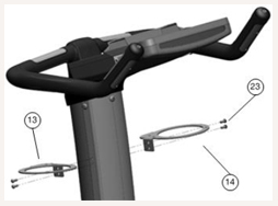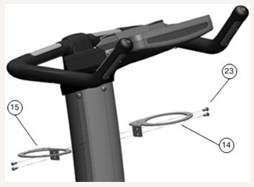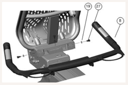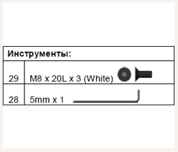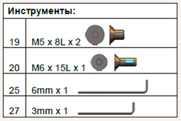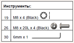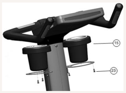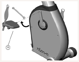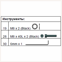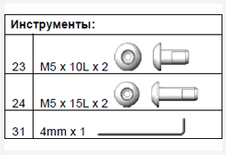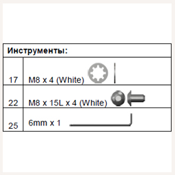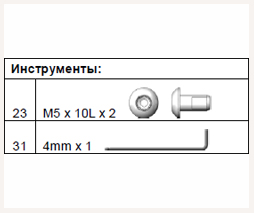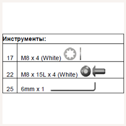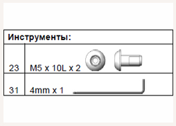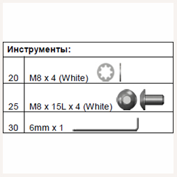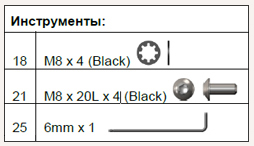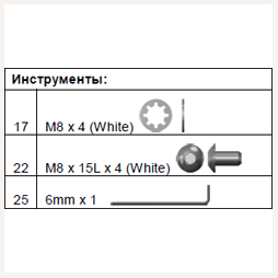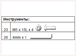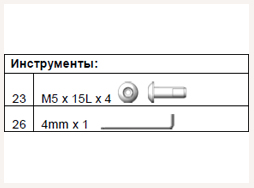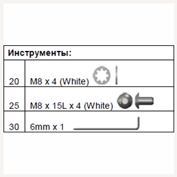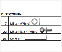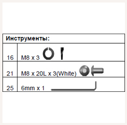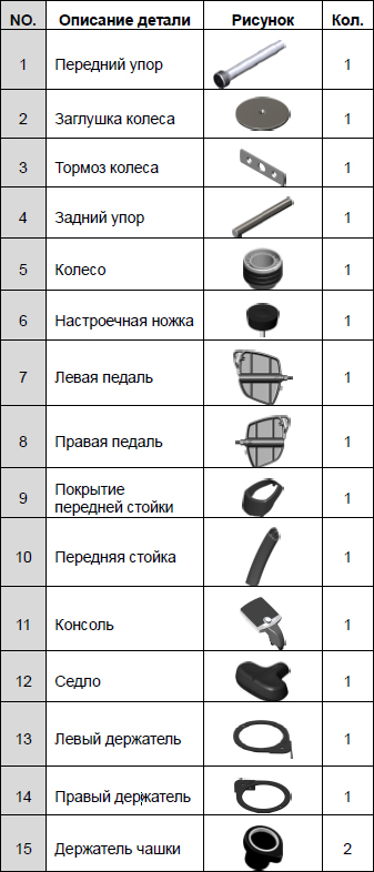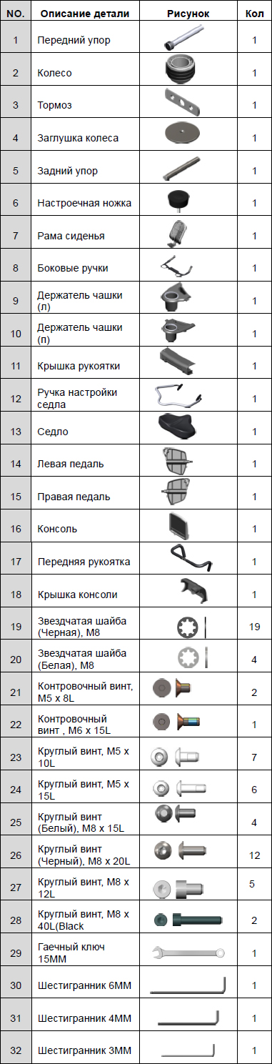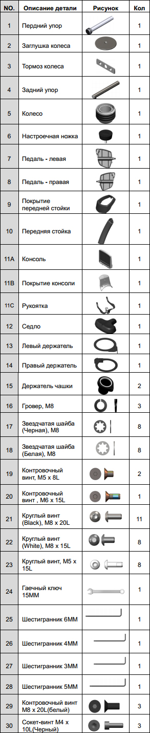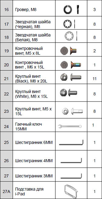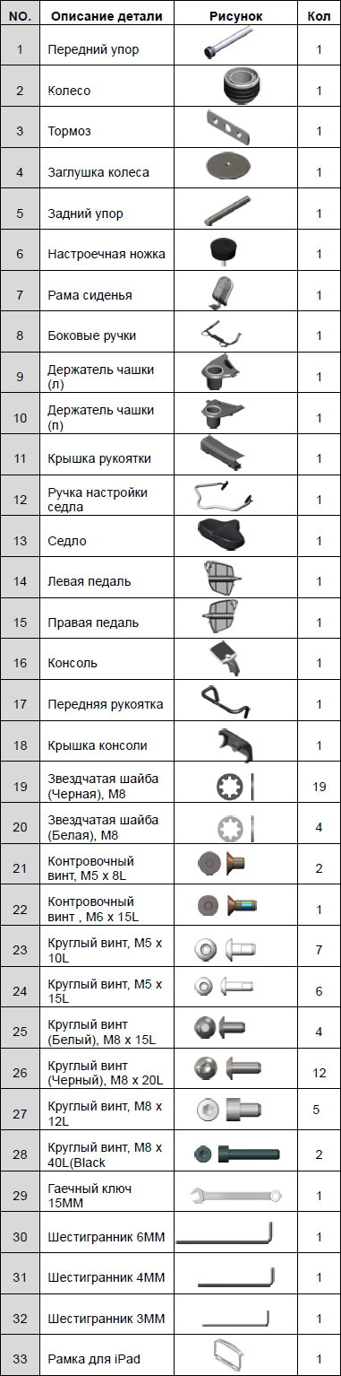 2. СБОРКА И НАСТРОЙКА 550UBi - список деталей Сначала необходимо открыть коробку, удалить из нее весь пенопласт и картон. Проверьте наличие всех необходимых деталей по списку перед началом сборки. В списке указаны детали, необходимые для сборки в пунктах 2.1 (рама 550UBi и 550Ube) и 2.2 (консоль 550UBi). 550UBe - список деталей Сначала необходимо открыть коробку, удалить из нее весь пенопласт и картон. Проверьте наличие всех необходимых деталей по списку перед началом сборки. В списке указаны детали, необходимые для сборки в пункте 2.3 (550UBe – мультимедиа консоль). 2.1 Сборка - 550UBI и 550RBE рама тренажера ШАГ 1. Установка переднего упора ШАГ 2. Установка колеса ШАГ 3. Установка заднего упора ШАГ 4. Установка настроечных ножек ШАГ 5. Установка седла ШАГ 6. Установка левой педали ПРИМЕЧАНИЕ 1. Ключ нужно вращать в том же направлении, как показано на рисунке. 2. Убедитесь, что педаль левая. ШАГ 7. Установка правой педали ПРИМЕЧАНИЕ 3. Ключ нужно вращать в том же направлении, как показано на рисунке. 4. Убедитесь, что педаль правая. 2.2 Сборка- 550UBi - Интерактивная консоль ШАГ 8. Установка вертикальной стойки (1) ПРИМЕЧАНИЕ 1. Перед сборкой нужно расположить провода внутри стойки. Следите, чтоб они не повредились в процессе сборки. 2. Покрытие вертикальной стойки (9) нужно тщательно закрепить. ШАГ 9. Закрепление вертикальной стойки (2) ШАГ 10. Установка консоли Шаг 11. Установка рамки для iPad ШАГ 12. Установка левого и правого держателей ШАГ 13. Установка держателей чашек Сборка окончена. 2.3 Сборка- 550UBe консоль мультимедиа ШАГ 8. Установка вертикальной стойки (1) ШАГ 9. Закрепление вертикальной стойки (2) ШАГ 10. Установка консоли (1) ШАГ 11. Установка консоли (2) ПРИМЕЧАНИЕ Очень осторожно проводите кабели через отверстия в рукоятке. ШАГ 12. Установка консоли (3) ШАГ 13. Установка консоли (4) ПРИМЕЧАНИЕ Важно убедиться в том, что провода не пережаты и не повреждены. ШАГ 14. Установка консоли (5) ПРИМЕЧАНИЕ Очень аккуратно подключайте провода. Убедитесь, что они не пережаты и не повреждены. ШАГ 15. Установка левого и правого держателей ШАГ 16. Установка держателей чашек. Сборка окончена. 550RBi - список деталей Сначала необходимо открыть коробку, удалить из нее весь пенопласт и картон. Проверьте наличие всех необходимых деталей по списку перед началом сборки. В списке указаны детали, необходимые для сборки в пунктах 2.4 (рама 550RBi и 550RBe) и 2.5 (интерактивная консоль 550RBi). 550RBe – список деталей Сначала необходимо открыть коробку, удалить из нее весь пенопласт и картон. Проверьте наличие всех необходимых деталей по списку перед началом сборки. В списке указаны детали, необходимые для сборки в пункте 2.6 (550RBe – консоль мультимедиа). 2.4 Сборка - 550RBi и 550RBe рама тренажера ШАГ 1. Установка переднего упора ПРИМЕЧАНИЕ Чтоб удобно установить упор, аккуратно приподнимите раму. ШАГ 2. Установка колеса ШАГ 3. Установка заднего упора ШАГ 4. Установка настроечной ножки ШАГ 5. Установка рамы сидения ШАГ 6. Установка рукоятки (1) ШАГ 7. Установка боковых ручек (2), подключение проводов ПРИМЕЧАНИЕ Важно убедиться в том, чтоб цвета разъемов и проводов кабелей совпадали. ШАГ 8. Установка левого держателя чашки ШАГ 9. Установка правого держателя чашки ШАГ 10. Установка покрытия рукоятки Шаг 11. Установка ручки настройки седла ШАГ 12. Установка седла ШАГ 13. Установка левой педали ПРИМЕЧАНИЕ 1. Ключ нужно вращать в указанном направлении 2. Убедитесь, что педал
