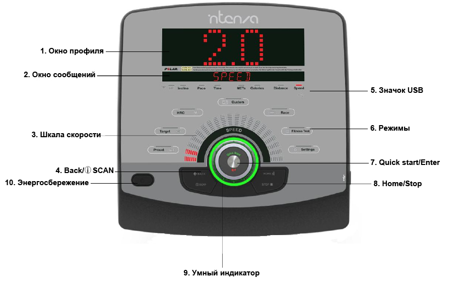 4. Кнопка Back/Scan:  BACK | Во время настройки программы, нажмите эту кнопку для возврата на уровень выше. | При вводе текста. Нажмите эту кнопку для корректировки введенных данных. | | SCAN | Во время тренировки, параметры тренировки по очереди отображаются на экране информации. Нажмите SCAN для постоянного отображения одного из них. | 5. USB: данный индикатор включается, когда консоль тренажера определяет подключение USB устройства.