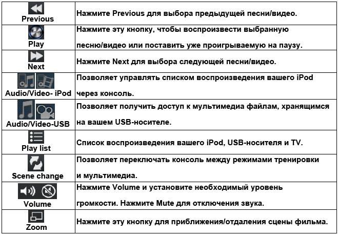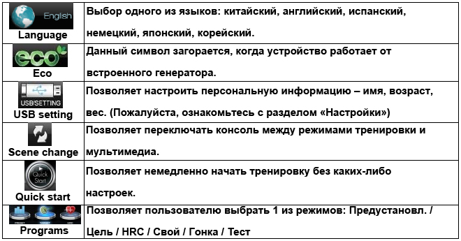 HOME | Нажмите эту кнопку для перехода к стартовому меню, если это необходимо. | Во время настройки режима, нажмите на эту кнопку для двойного подтверждения. |  STOP | Эта функция кнопки активна только при запущенной программе тренировки. Нажмите STOP для приостановки выполнения программы. Подробная информация о тренировке будет выведена на экран. Повторное нажатие STOP приведет к завершению тренировки. | 9. Умный индикатор: цвет индикатора указывает на уровень нагрузки.