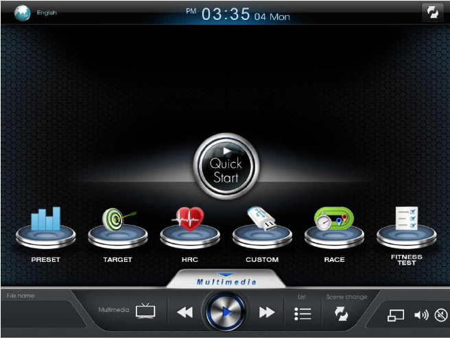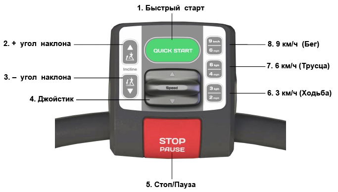 | 1. Быстрый старт: позволяет запустить двигатель тренажера на скорости 0,8 км/ч и 0% подъеме.