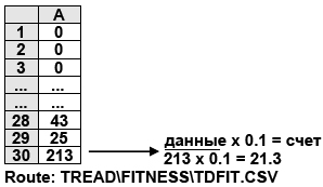 - Значения от В до AE соответствует скорости тренировки, которая была каждую минуту.