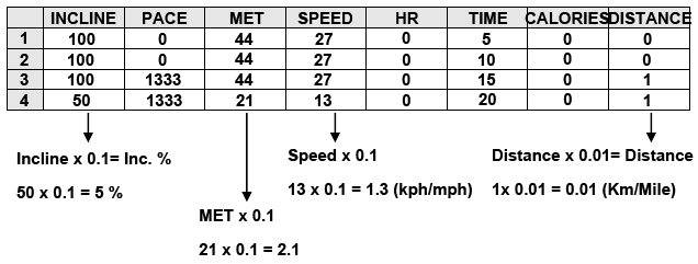 Значение, которое записано на USB носителе, следует умножить на модификатор, чтобы данные совпали с данными на консоли. А вот значение таких полей, как Incline, MET и Speed необходимо умножить на 0,1. Значение поля Distance - на 0,01. Файл TDWD0000.CSV располагается в папке WKODATA, которую можно найти в папке TREAD. Пример таблицы: