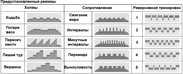 4.2 Основные предустановленные режимы Все тренажеры серии 550 от Intenza обладают тремя основными группами упражнений, которые способны удовлетворить все Ваши потребности. К ним относятся угол, сопротивление, а также реверсивная тренировка. Каждый из этих режимов обладает своими преимуществами и позволит Вам достичь отличных физических результатов. Когда включен предустановленный режим, светодиодная матрица будет отображать такие данные профили тренировки, как угол наклона и сопротивление на каждом участке.