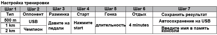 - После завершения гонки, тренажер перейдет в РЕЖИМ ОТДЫХА длительностью в 4 минуты.