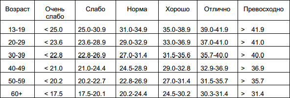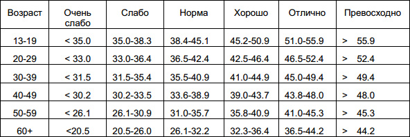 Следуйте сообщениям на экране для работы в этом режиме на велотренажерах 550UBe или 550RBe. ТАБЛИЦА VO2 Мужчина (Значения для миль/кг/минут)