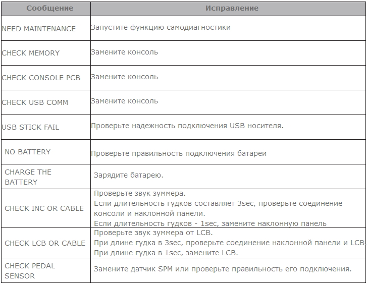 - Увидев на экране сообщение об ошибке, Вам необходимо следовать инструкциям руководства по ремонту и обслуживанию тренажерного оборудования.