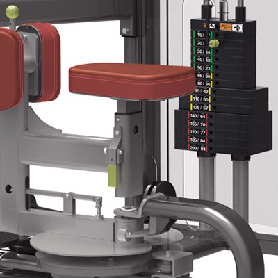 При помощи магнитного селектора удобно выбирать нагрузку. Даже сидя на тренажере можно просто дотянуться до весового стека. Развесовка в фунтах и килограммах.