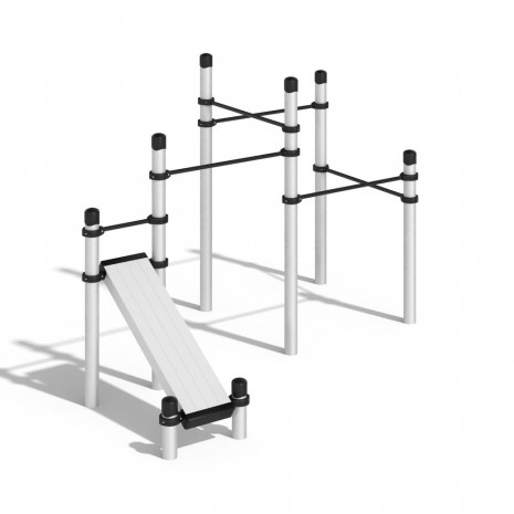 Комплекс состоит из восьми опорных столбов высотой: 2 шт. - 2300 мм, 2 шт. - 2000 мм, 2 шт. – 1500 мм и 2 шт. – 400 мм, пяти перекладин для подтягиваний длиной 1200 мм и наклонной скамьи. Элементы крепятся к опорным столбам при помощи хомутов. Высота фиксации перекладин для подтягиваний: 1 шт. – 1900 мм, 2 шт. – 1700 мм, 1 шт. – 1300 мм, 1 шт. – 1100 мм. Наклонная скамья для упражнений на пресс крепится на высоте 1000 мм от поверхности основания в верхней части и на высоте 275 мм в нижней части. Перекладина для удержания руками крепится на высоте 1350 мм. Длина комплекса не более 4100 мм.