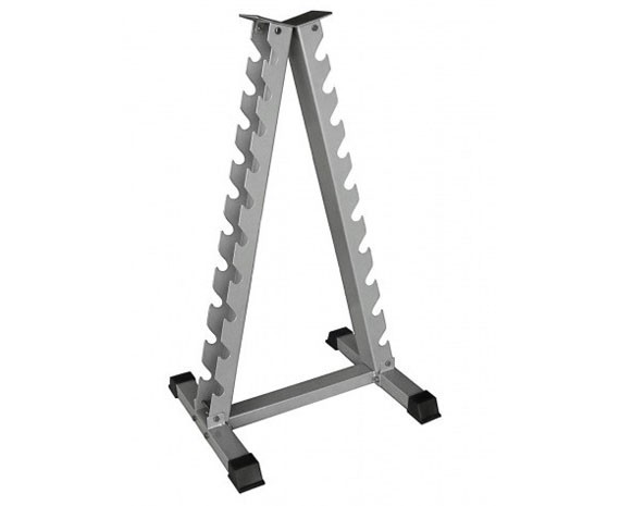 Стойка имеет оригинальную форму в форме «елочки» и способна вместить до 10 пар гантелей.