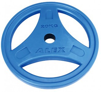 Диск P-ROBC-20K-ALEX бренда Alex – обрезиненный нескользящий диск синего цвета с тремя отверстиями для хвата. Вес диска 20 кг.