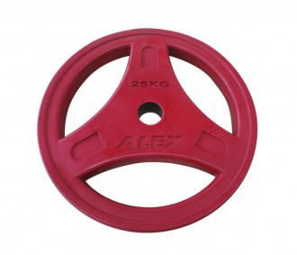 Диск P-ROBC-25K-ALEX бренда Alex – обрезиненный нескользящий диск красного цвета с тремя отверстиями для хвата. Вес диска 25 кг.