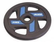 Диск P-TPU-20K-ALEX бренда Alex – полиуретановый нескользящий цветной диск синего цвета с четырьмя отверстиями для хвата. Вес диска 20 кг.