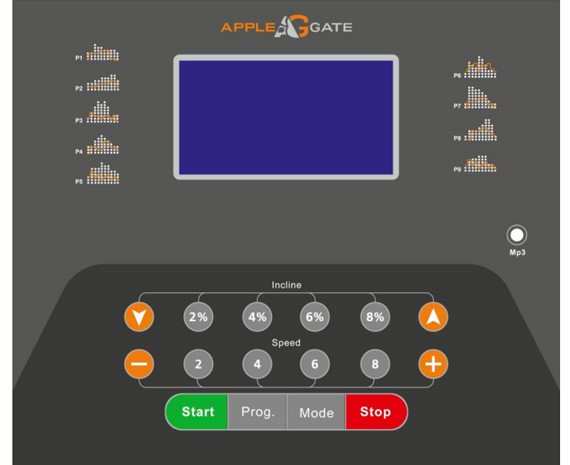 Беговая дорожка T20 A бренда AppleGate с электрическим углом наклона отлично сочетает в себе базовые и расширенные функции. Надежный двигатель постоянного тока производства Schneider Electric имеет мощность 1,75 л.с. Он обеспечивает уверенно движение бегового полотна на скорости от 0,8 до 12 км/ч. Характеристики мотора позволяют тренироваться на дорожке пользователям весом до 120 кг. Довольно просторное беговое полотно имеет размер 122 х 40 см, чего вполне достаточно для комфортной ходьбы или бега трусцой. Угол наклона полотна регулируется в диапазоне от 0 до 15% электрическим путем.