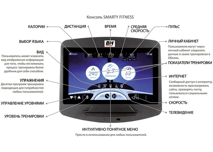 Многофункциональная панель с удобным меню настроек, расположенная под углом 45°, облегчает тренировочный процесс и вносит в него развлекательные элементы.
