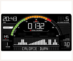 Информация о тренировке выводится на дисплей диагональю в 9 дюймов, который установлен на консоли. Кроме привычного спидометра, одометра, калориметра на этой дорожке предусмотрена установка системы поминутного подсчета расходуемых калорий. Это очень удобно, так как позволяет понять насколько эффективным является выбранный темп тренировки. Если интенсивность тренировки превышает обычные показатели, то система оповестит об этом пользователя при помощи специального звукового сигнала. Это является отличной мотивацией для подсчета расходуемых калорий.