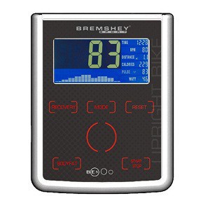 Велоэргометр BREMSHEY BE5 Компьютер Программный дисплей Цветной ЖК дисплей с подсветкой Время - Дистанция - Скорость - Обороты в минуту + Потребление энергии + Мощность тренировки (W) + Пульс - Программы всего 16 Пользовательские программы 4 Режимы тренировки Предустановленные программы 6 HRC программы 55%, 75%, 90%, TAG Программы регулировки Восстановление пульса + Количество жира в теле - Ячейки для регистрации пользователей + Технические данные Сопротивление маховика Постоянное магнитное, сервомотор Передаточное отношение Масса маховика 9 кг Выходная мощность 350W при 100 об/мин ; 250 W при 60 об/мин Потребление энергии От сети 220 В (желателен стабилизатор напряжения) Адаптер 9 V / 0.5 A Длина Ширина Высота Вес Максимальный вес пользователя 135 кг Эргометр + EN-957 Class Использование Домашнее Эргономика Контактные датчики сердечного ритма + Нагрудный передатчик сердечного ритма Опция (5kHz аналоговый) Регулировка сидения Горизонтальная и по высоте Регулировка руля Эргономика Комфортное гелевое сидение Колеса для транспортировки +
