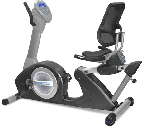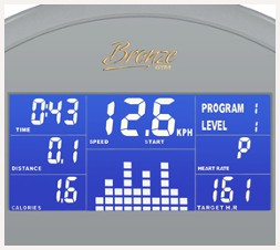 Многофункциональный голубой дисплей диагональю 14 см обладает удобной и понятной навигацией. На большом экране высвечивается профиль программы и основные параметры тренировки. Для разных пользователей представлено четыре классических тренировочных профиля, фитнес-тест, случайная тренировка, четыре пульсозависимых и четыре пользовательских режимов, а также программы жироанализатора Body Fat. Предустановленные значения в пульсозависимых тренировках составляют 60%, 75% и 85% от целевых показателей максимального пульса. Режимы жироанализатора включают индекс массы тела BMI, телосложение BodyType и индекс метаболизма BMR. Максимальный вес пользователей во время использования велотренажера Bronze Gym R801 LC не должен превышать 160 кг.
