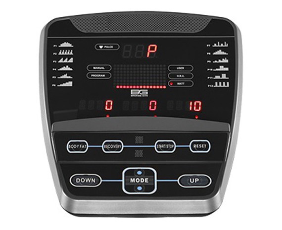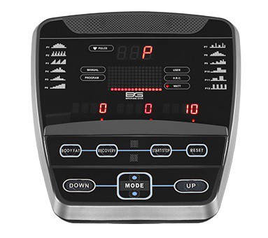 На дисплее отображаются все параметры тренировки. Всего предусмотрено наличие 22 различных режимов, в том числе 12 установленных программ, ручной режим, по 4 пользовательские и пульсозависимые программы, а также Ватт-режим, диапазон нагрузки в нем можно менять от 10 до 350 Ватт.