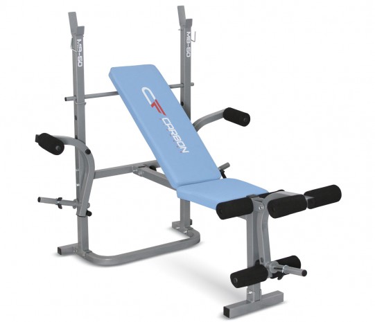 Складывающийся силовой тренажер MB-50 компании Carbon Fitness с огромным функционалом: жим штанги, разведение/сведение гантелей, разгибание/сгибание ног, рычаги «баттерфляй». Крепкая рама рассчитана на максимально допустимую весовую нагрузку до 140 кг. Спинка скамьи имеет 45°-ый регулируемый угол наклона. Система нагружения – диски (26 мм), штанга.