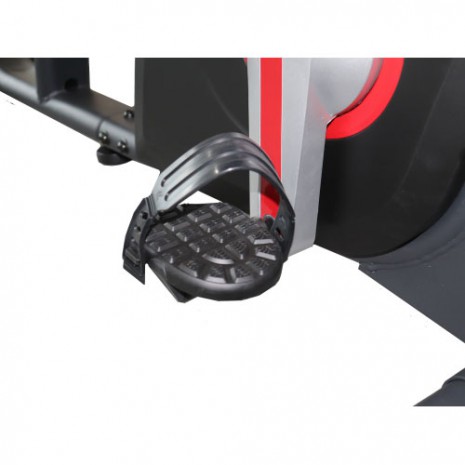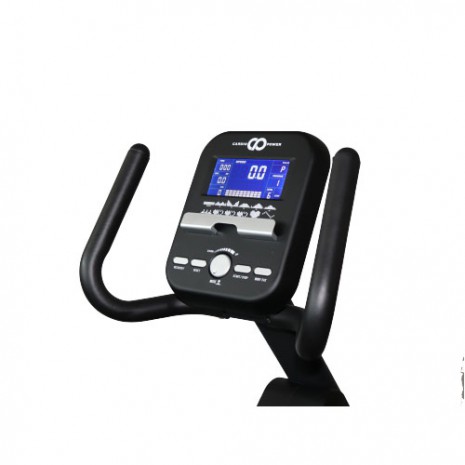 Работа системы сопротивления обеспечивается с помощью тяжелого маховика, который создает запас нагрузки. Современная консоль с информативным LCD дисплеем обеспечивает доступ к функциям тренажера. Отображаемые на дисплее параметры позволяют отслеживать ход тренировки. За счет качества используемых материалов и комплектующих, в том числе усиленного стального корпуса, качественного пластика, износоустойчивых приводных элементов и усиленных подшипников, обеспечивается высокая надежность велотренажера.