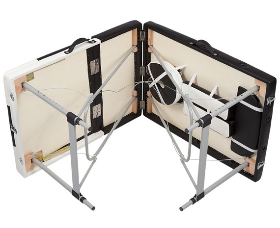 Складная форма массажного стола обеспечивает быстрое сложение для удобства транспортировки. Конструкцию упаковывают в специальную сумку, которую можно нести на плече.