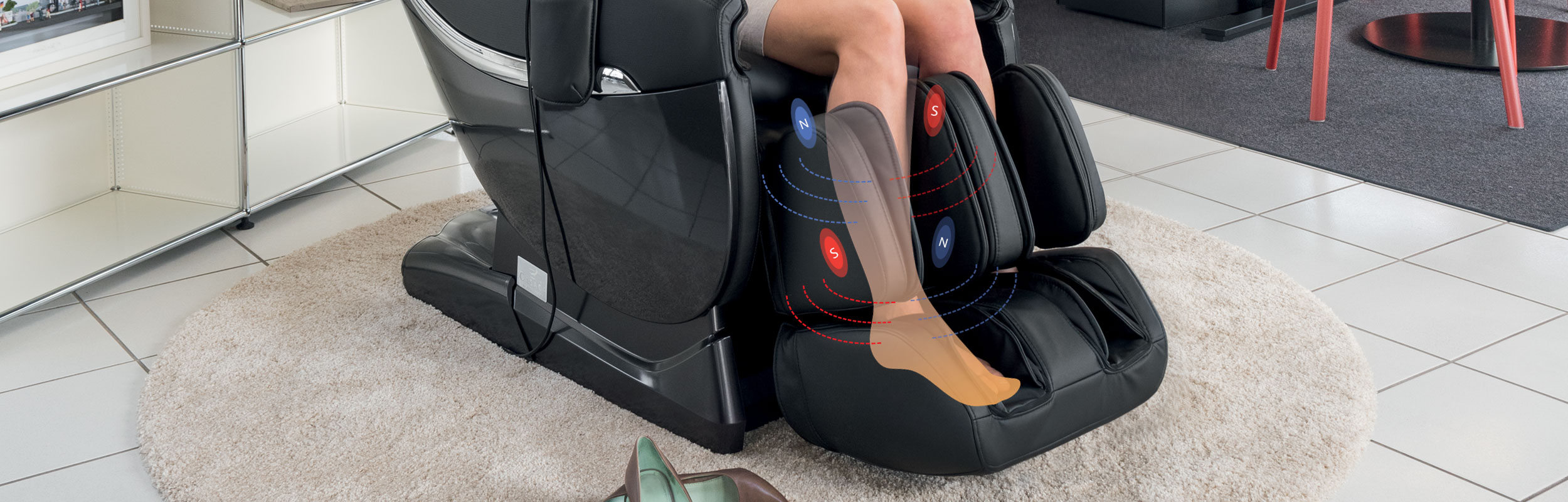 Магнитотерапия: Во время массажа восемь постоянных магнитов стимулируют точки акупунктуры на икрах. Благодаря такой процедуре обеспечивается восстановление нормального электрического потенциала биологических точек, благодаря чему человек ощущает увеличение бодрости.