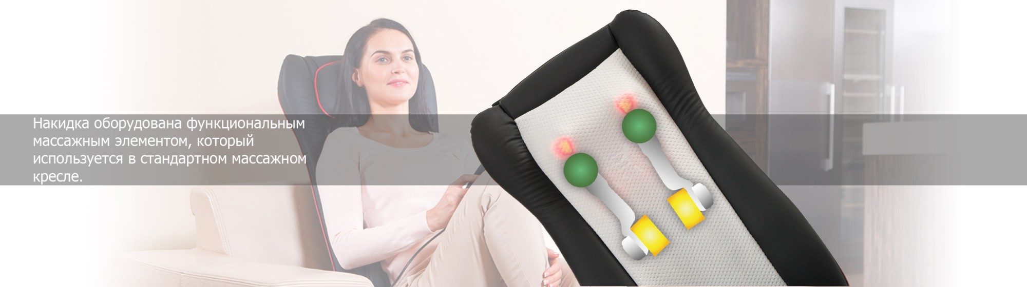 Благодаря продуманной конструкции и дальновидности конструкторов накидка оборудована функциональным массажным элементом, который используется в стандартном массажном кресле. Массажные ролики имеют возможность передвигаться по трем осям. И таким образом абсолютно обычные для массажных накидок массажные процедуры (шиацу и роликовий) дают совершенно новые эффекты.