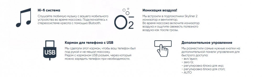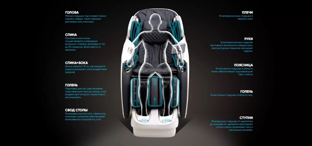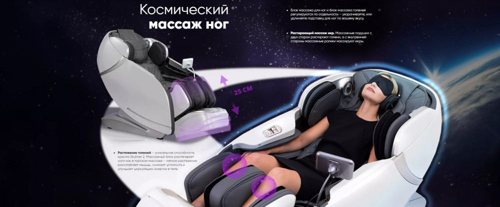 Растяжение голеней – уникальная способность кресла Skyliner 2. Массажный блок растягивает ноги как в тайском массаже – мягкое растяжение расслабляет мышцы, снимает усталость и улучшает циркуляцию энергии в теле.