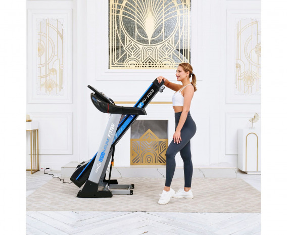 Электрическая беговая дорожка DFC Fytter RU-10 оснащена складной конструкцией, что позволяет легко и быстро сложить тренажер одним движением с помощью гидроцилиндра. Максимальный вес пользователя составляет 160 кг, что делает тренажер подходящим для людей с разной физической подготовкой.