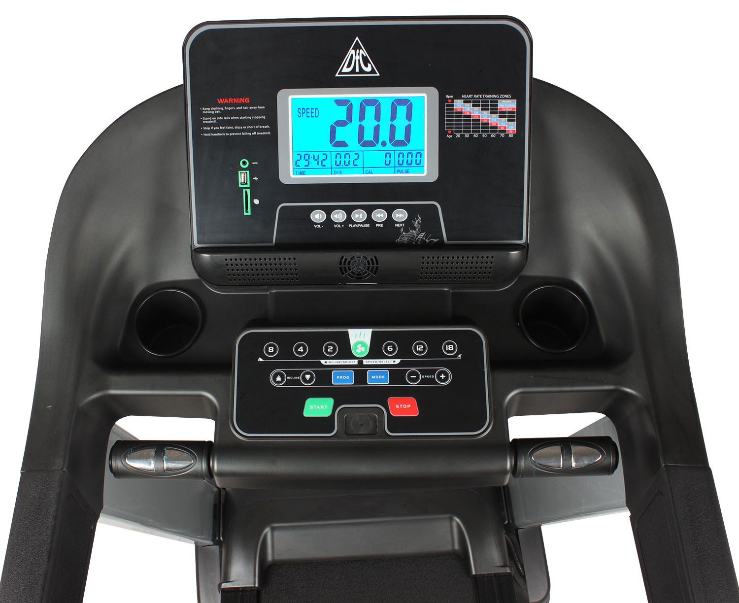 Дорожка оснащена удобной консолью с информативным LCD дисплеем. Встроенные в консоль динамики позволяют заниматься под музыку, подключение которой осуществляется через разъем MP3 и USB-порт. Для удобства управления проигрывателем кнопки расположены на консоли под экраном. В консоли предусмотрен встроенный вентилятор, что увеличивает комфортность занятий. По обеим сторонам консоли удобно расположены держатели для бутылки с водой.