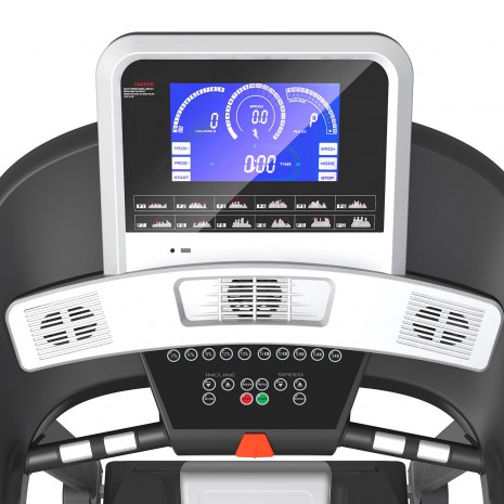 Эта модель беговой дорожки оснащена современной консолью с легко читаемым информативном LCD дисплеем размером 10,1 дюймов. На дисплее в постоянном режиме наглядно отображается весь ход тренировки с помощью графических диаграмм и тренировочных параметров, таких как пройденное расстояние, время тренировки, скорость, угол наклона, количество затраченных калорий, пульс и др.