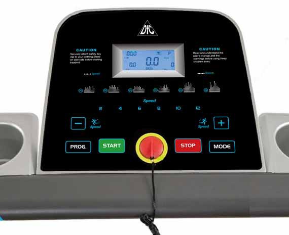 Монохромный LCD дисплей с голубой подсветкой. 6 предустановленных программ. Сенсорные кнопки для изменения скорости. Переключение программ обеспечивается с помощью сенсорной панели, а для быстрого включения и выключения тренажера есть кнопки Старт и Стоп. Магнитный ключ безопасности с прищепкой.