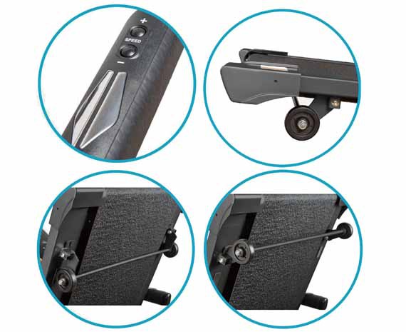 Регулировка скорости в диапазоне 1-12 км/ч обеспечивается сенсорными кнопками и дублирующими кнопками, расположенными на поручнях. Поручни снабжены датчиками пульса.