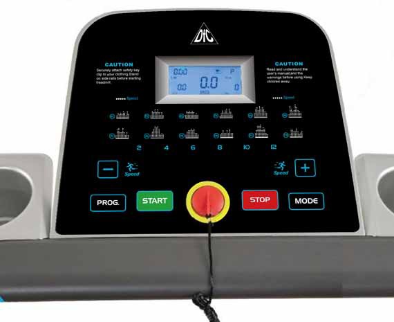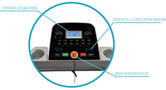Монохромный LCD дисплей с голубой подсветкой. 12 предустановленных программ. Сенсорные кнопки для изменения скорости. Переключение программ обеспечивается с помощью сенсорной панели, а для быстрого включения и выключения тренажера есть кнопки Старт и Стоп. Магнитный ключ безопасности с прищепкой.