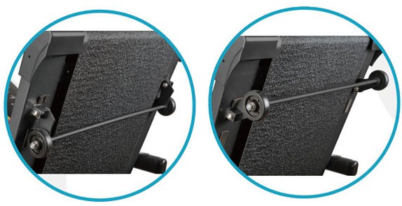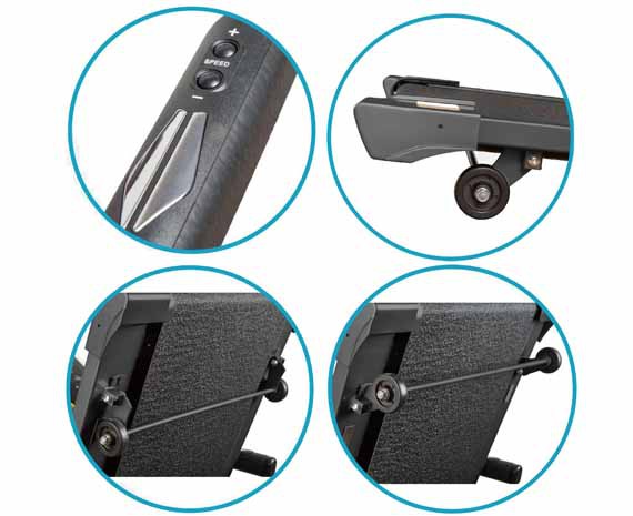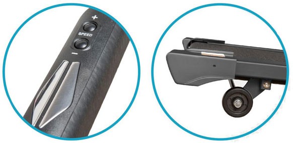 Регулировка скорости в диапазоне 1-16 км/ч обеспечивается сенсорными кнопками и дублирующими кнопками, расположенными на поручнях. Поручни снабжены датчиками пульса.