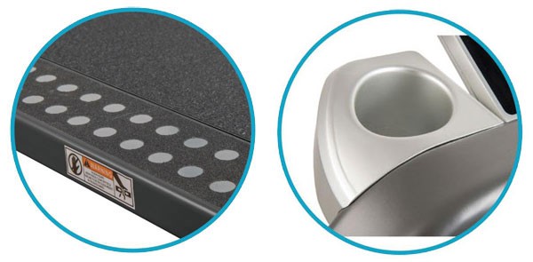 С двух сторон по краям бегового полотна расположены подножки, имеющие антискользящее покрытие. Два держателя для бутылочки с водой.