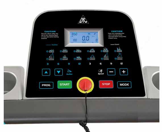 Монохромный LCD дисплей с голубой подсветкой. 12 предустановленных программ. Сенсорные кнопки для изменения скорости. Переключение программ обеспечивается с помощью сенсорной панели, а для быстрого включения и выключения тренажера есть кнопки Старт и Стоп. Магнитный ключ безопасности с прищепкой.