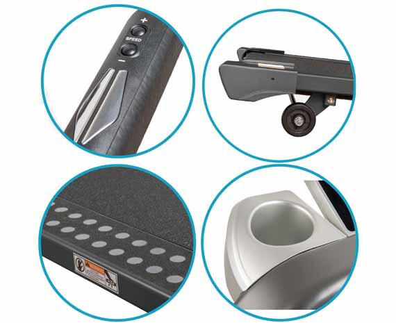 С двух сторон по краям бегового полотна расположены подножки, имеющие антискользящее покрытие. Два держателя для бутылочки с водой.