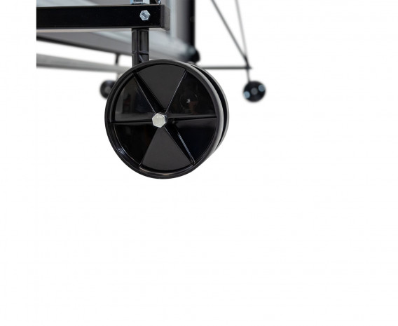 Рама стола выполнена из стальной трубы диаметром 36 мм и покрыта порошковой краской, что обеспечивает надежную защиту от коррозии и механических повреждений. Круглый трубчатый профиль диаметром 25 мм обеспечивает стабильность и устойчивость стола во время игры, а также облегчает его перемещение благодаря наличию четырех двойных прорезиненных колес диаметром 125 мм.