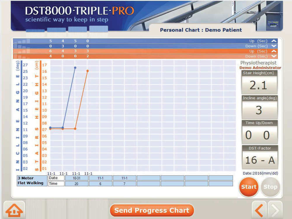 Отслеживание и отображение прогресса DST 8000 Triple Pro — это понятный и удобный интерфейс для управления программным обеспечением и мониторингом терапии пациента. Тренажер отображает данные предыдущего сеанса, что позволяет отслеживать прогресс пациента. В ходе выполнения упражнений формируются графические показатели прогресса пациента, фиксирующиеся на протяжении всей тренировки. Полученные данные можно скачать или отправить на электронную почту.