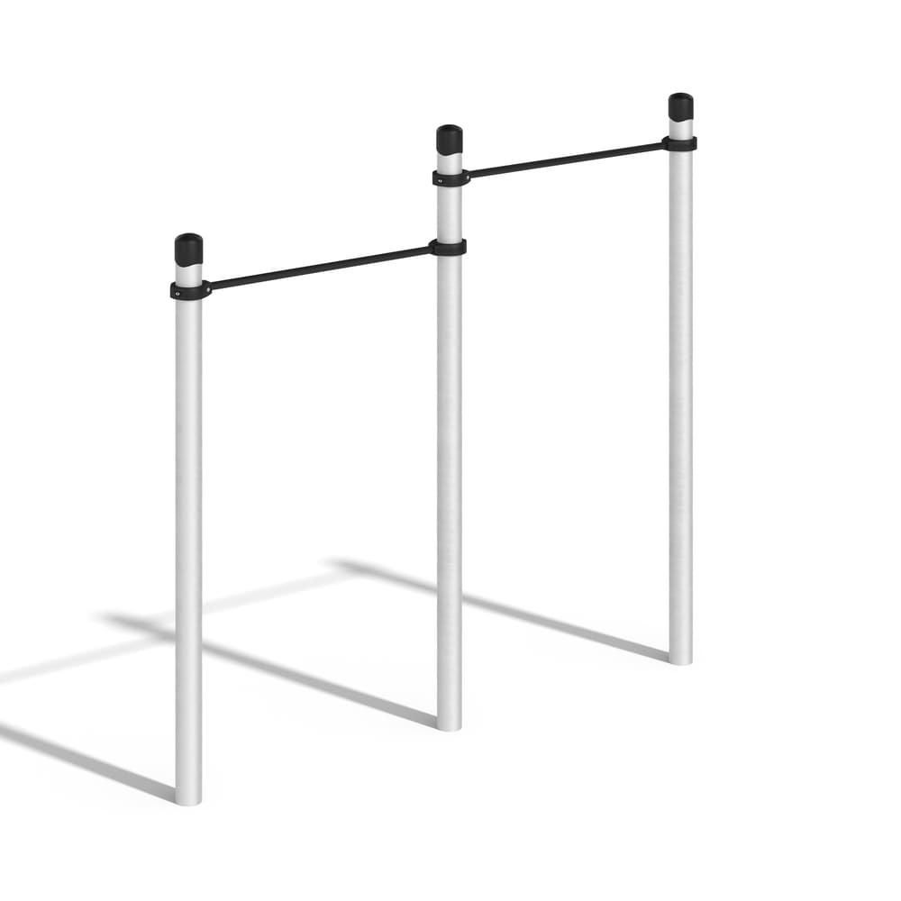 Двойной турник на опорных столбах диаметром 108 мм подходит для подтягиваний, качания пресса, ног и большинства силовых упражнений с собственным весом. Перекладины защищены от обледенения, не скользят и выдерживают 9-кратные нагрузки благодаря соединению «хомут». Можно заниматься зимой. Оборудование получило сертификат TUV и рекомендовано для проведения чемпионатов и соревнований. Устанавливается на специальное покрытие, газон, грунт и песок во дворах, на стадионах, в парках и на пляжах.
