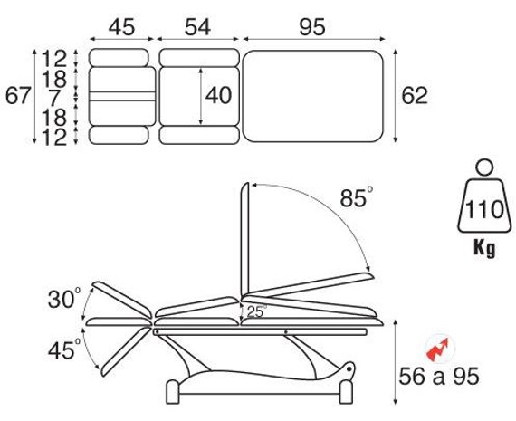 Конструкция невероятно удобна и практична в повседневном использовании. Главными отличительными особенностями можно выделить большое количество функций регулировки для изменения расположения тела клиента. Диапазон настройки высоты рабочей поверхности представлен от 56 см до 95 см. При желании можно настроить наклон каждой секции, в зависимости от индивидуальных особенностей человека и выбранной процедуры.