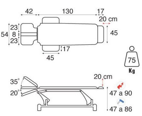 Для изменения определенных параметров предусмотрен удобный пульт. Представленная модель предусматривает все необходимые опции регулировки, чтобы клиент смогут с комфортом наслаждаться косметическими, лечебными или массажными процедурами. Диапазон изменения высоты рабочей зоны стола находится в пределах от 47 см до 90 см. Наклон подвижной секции стола регулируется от -20 градусов, до 35 градусов, благодаря чему можно учесть индивидуальные потребности пациента.